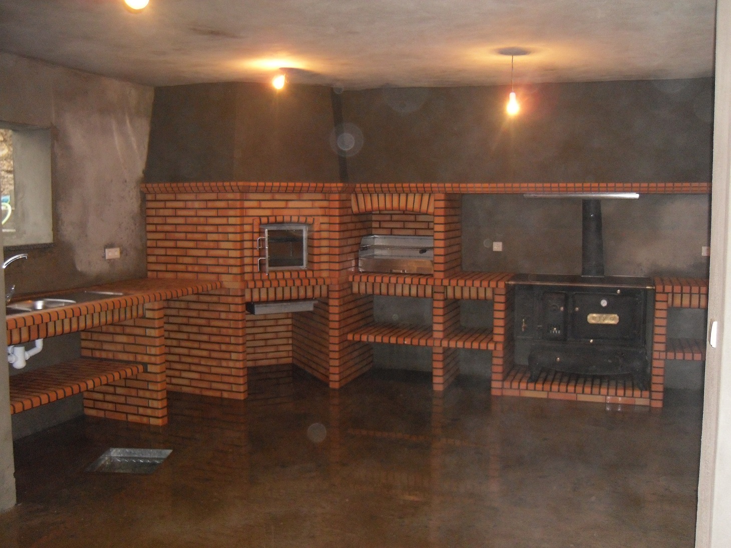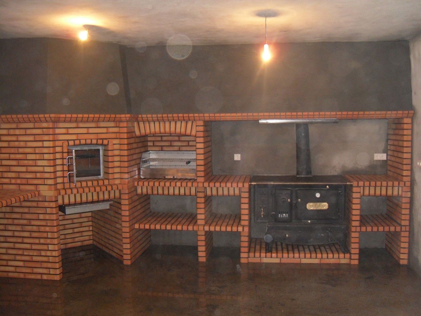 Esta churrasqueira foi constituida por Forno de Canto com porta dupla inox (preparada para leitões) com aparador de cinza. Churrasqueira com grelhador em Inox Reforçado de 60cm, 4 balcões de apoio, uma Banca com Escorredouro em inox, Fogão de Ferro Fundido, e o saco foi feito no local revestido a tijoleira de churrasqueira.